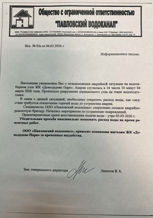• Ориентировочный срок восстановления подачи воды: утро 5 марта 2026 г.